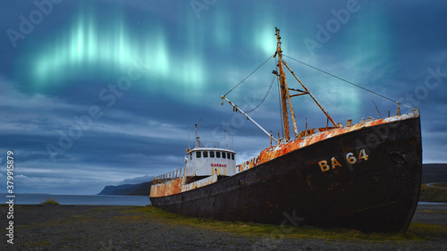aurora borealis enjoyed in front of a ship wreck during an autumn holiday in iceland