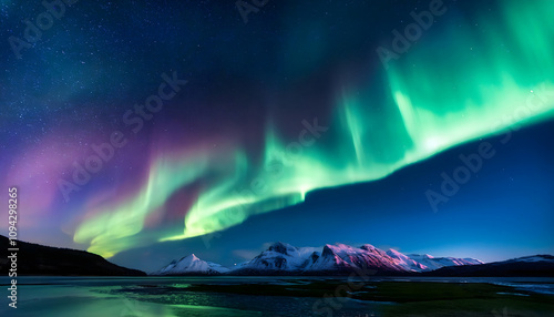 Aurora lights above in a dark night sky, formed when the solar wind tangles with the Earth's magnetic field