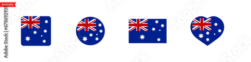 Australia flag icons. Australia flag set symbols. National symbol. Square, circle, heart shape flags. Vector isolated