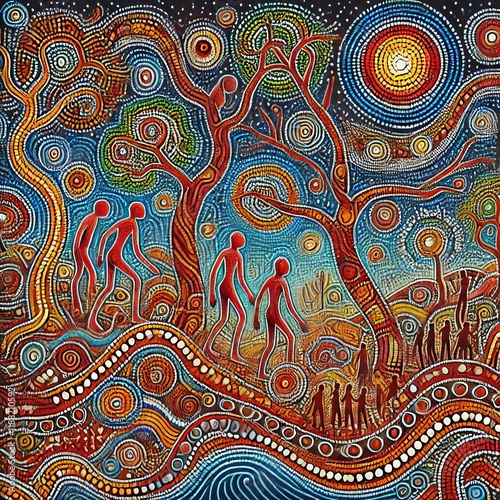 Australian Aboriginal dot painting style art dreamtime story of the land.