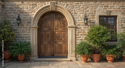 Authentic Italian house exterior with arched wooden door and decorative plant pots alongside copy space