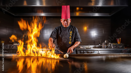 authentic japanese teppanyaki chef tossing food