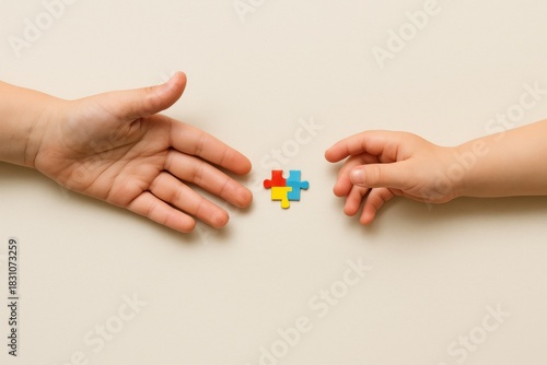 Autism Awareness Day puzzle concept with two hands holding colorful puzzle piece