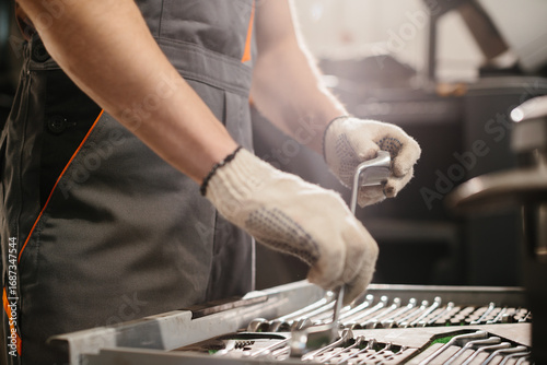 Auto mechanic choosing right wrench for repairing trucks in workshop