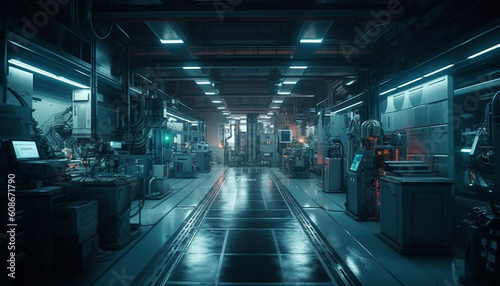 Automated conveyor belt in futuristic factory illuminates heavy machinery at night generated by AI