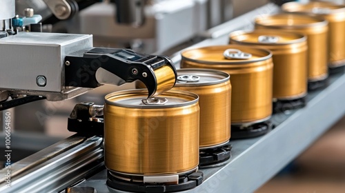 Automated robotic arm placing golden cans on a production line, showcasing modern beverage manufacturing technology and efficiency.