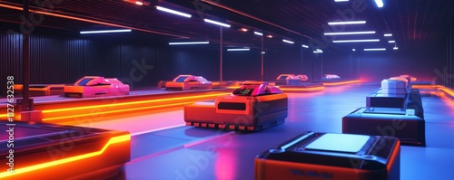 Automated robotic system sorting inventory on conveyor belts, hightech warehouse, futuristic lighting, efficient layout