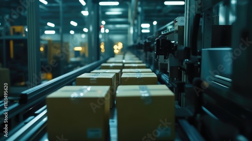 Automated robotic warehouse at nighttime, stacked with boxes ready for shipment.