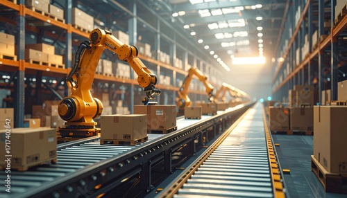 Automated Warehouse Efficiency: Robotic arms orchestrate a symphony of order, efficiently moving boxes along an industrial conveyor belt within a vast warehouse.