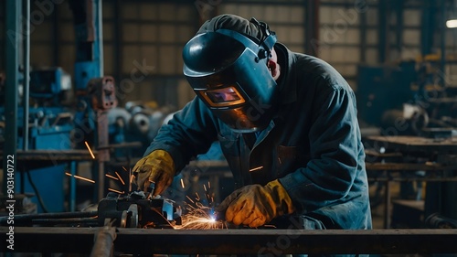 Automated welding and metal joining process with close up of welding robot safety gear and technician’s precision in action