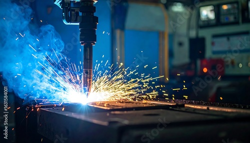 Automated Welding Process: Robotic Arm Creates Shower of Sparks in Industrial Setting