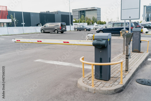 Automatic barrier gate at parking lot entrance with security system and protective railing, representing access control, vehicle management and modern urban infrastructure technology
