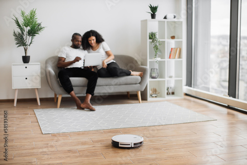 Automatic robot vacuum cleaning wooden floor while happy young couple resting on background. Two multicultural in love spending time for watching movie instead of households.