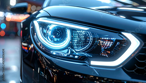 Automotive Brilliance: A close-up view of a sleek, modern car's headlight, with its luminous glow reflecting the vibrant city lights.