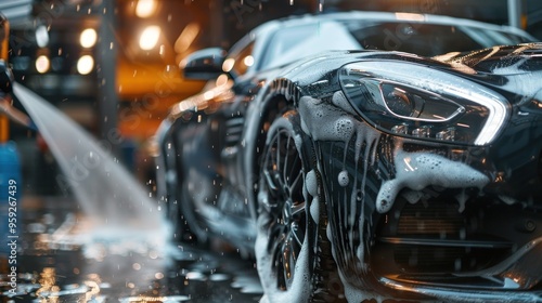 Automotive Detailer Cleaning car with High Pressure Water Washer. AI generated images