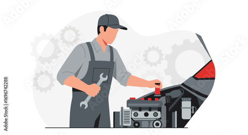 Automotive Technician Repairing Car Engine Illustration with Gray Background and Tools