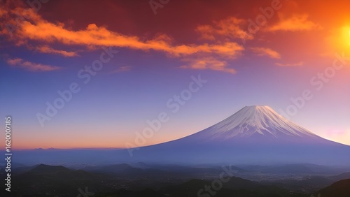 Autumn colors surround the iconic Japanese volcano, Mount Fuji, with its snow-capped peak reflecting in a tranquil lake at sunset