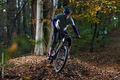 Autumn Forest Mountain Biker Navigates Leaf-Covered Trail with Speed and Focus