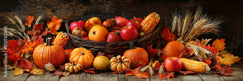 Autumn Harvest Basket with Pumpkins, Apples, and Corn