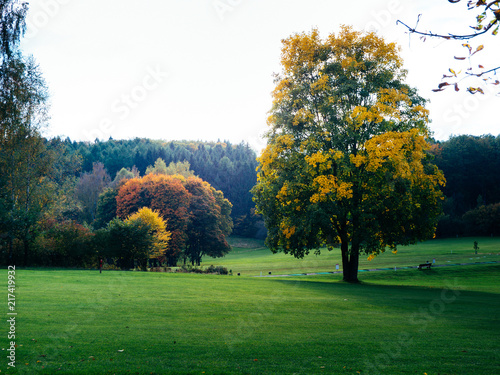 Autumn landscape with tree front and colorful leaves