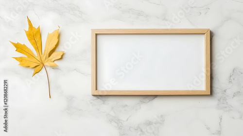 Autumn leaf beside blank frame on marble; fall mockup for design