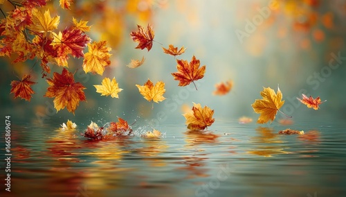 Autumn leaves falling on calm water