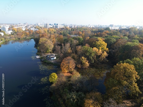Autumn Park from a Bird’s Eye View Trees, Water, and City on the Horizon