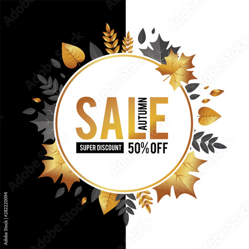 Autumn Sale. Luxurious advertising banner with golden season falling leaves.
