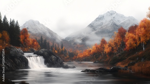 Autumn Waterfall in Misty Mountain Valley