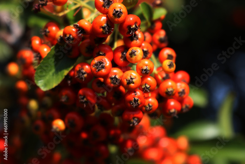 Autumnal background with copy space. Pyracantha bush with orange berries, also called Firethorn