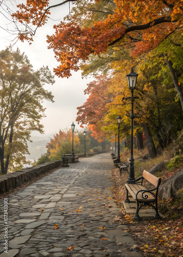 Autumnal pathway with stone cobblestones and benches.