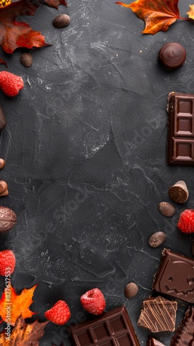 Autumn-themed chocolate and raspberries on a black background. Seasonal treats, fall dessert, holiday confectionery, gourmet chocolate concept. Copy space. Vertical