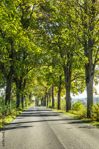 Avenue of trees in autumn. Beautiful road. Background. Sunlight. Nature. Poland.
