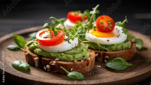 Avocado toast with poached eggs, cherry tomatoes and arugula on whole grain bread.