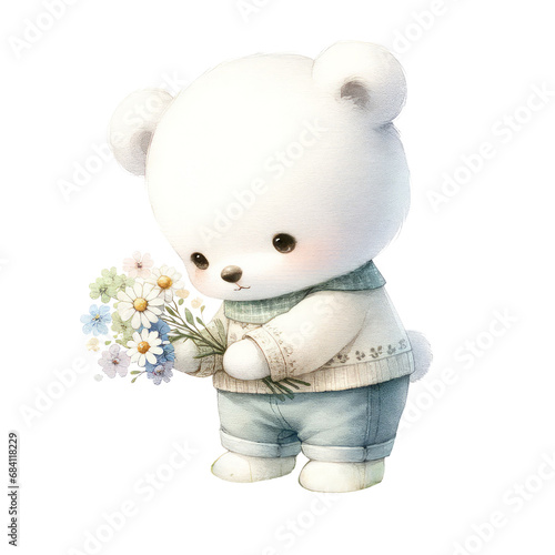 Baby Cute White bear with a flower on white background.