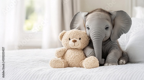 Baby elephant hugging a teddy bear, soft colors, minimal style, white background