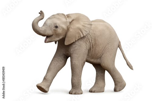 Baby elephant walking on transparent background, raising trunk, young animal, isolated, cutout