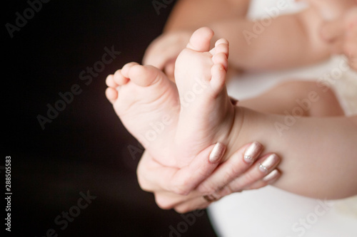 Baby feet in mother hands. Mom and her Child. Happy Family concept. Beautiful conceptual image of Maternity