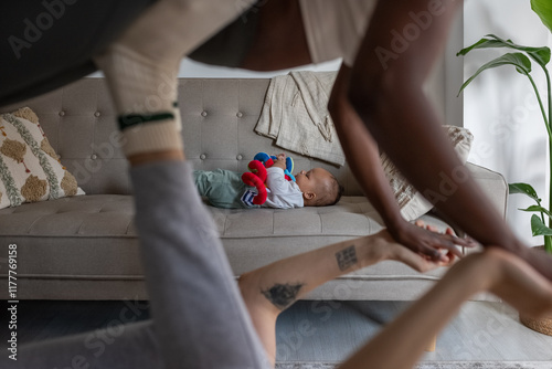 Baby playing with toy on couch
