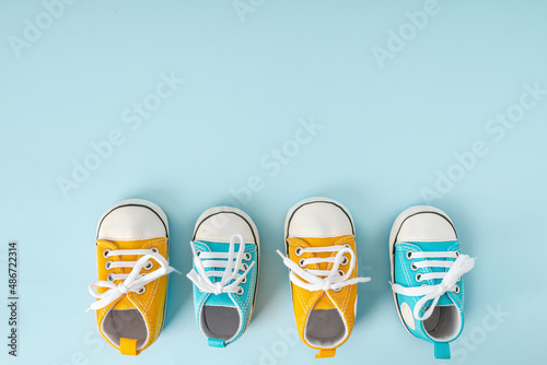 Baby's little shoes on a colorful background. The concept of waiting for a baby and the concept of traveling with baby, children's lifestyle. Copy space, flat lay