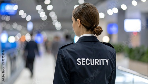 Back of a woman in security uniform observing a busy walkway