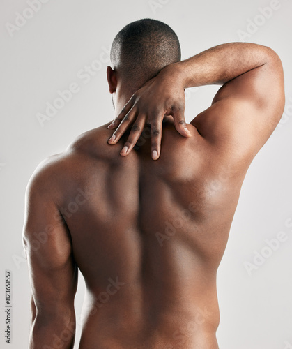 Back, stretching and man in studio with body health, pain or fitness and exercise for gym. Bodybuilder, sports and white background with muscle of model for training, hand for anatomy or growth