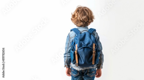 Back to School - Rear View of Child with Backpack on White Background for Advertisement