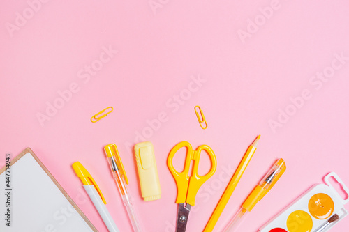 Back to school. Composition with opened copybook and yellow office supplies on pink background. Flat lay. Copy space. Concept of education and creativity