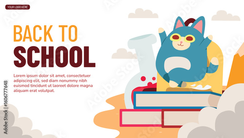 Back to School Cute Cat Banner with School Elements