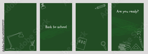Back to School poster doodle design set. Social Media Template with school textbook book backpack paint. Background banner cover flyer design. Vector illustration.