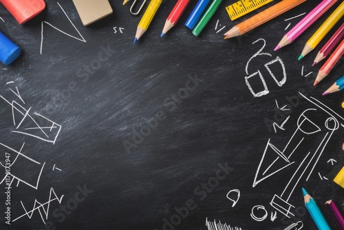Back to school supplies frame on chalkboard.