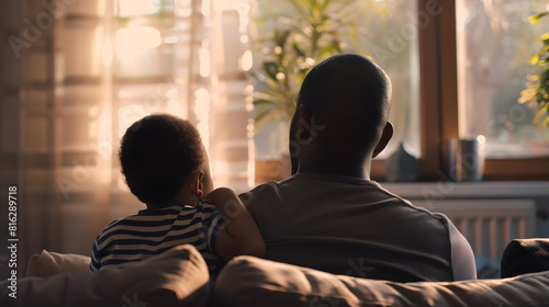 Back view of dad sit on couch with preschooler son talking sharing thoughts or problems loving father speak have conversation with little boy child support him showing care and underst : Generative AI