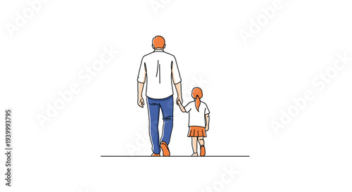 Back view of father and young daughter with red hair walking together hand in hand on white background for family love and support concept.