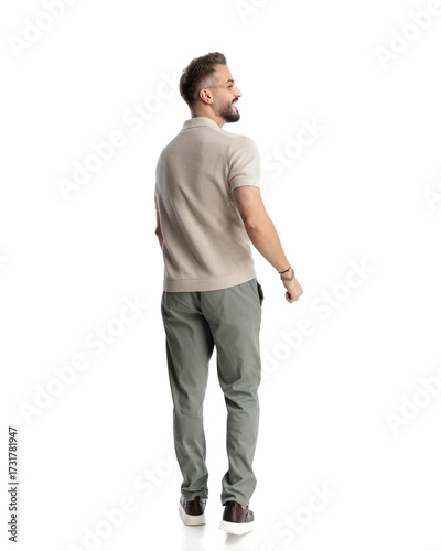 back view of happy young man looking to side and laughing